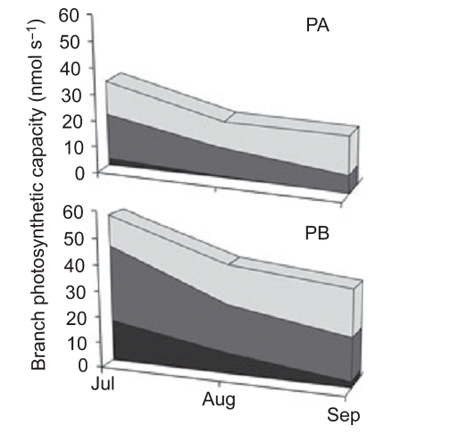 ±¾ÎÄÑо¿ÁËRhododendron ferrugineum£¨¸ßɽõ¹å¶Å¾é£¬£¬£¬£¬£¬£¬¶Å¾éÊôģʽÖÖ£©¾»¹âºÏÄÜÁ¦ÓëҶƬÊÙÃüµÄ¹ØÏµ£¬£¬£¬£¬£¬£¬·¢Ã÷Óиü¶à½ÏÀÏҶƬµÄÖÖȺÆä¹âºÏÄÜÁ¦¸üÇ¿£¨Í¼ÖÐÉîÉ«ÇøÓòΪһÄêҶƬºÍ¶þÄêҶƬ£©¡£¡£¡£¡£¡£¡£¡£¡£